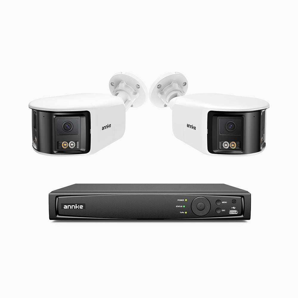 FDH600 - Kit videosorveglianza PoE 8 canali con 2 doppia lente telecamere 6MPX, ultra grandangolo 180°, visione notturna intelligente a doppia luce, audio bidirezionale, sirena e allarme attivi, rilevamento persone e veicoli, IP67