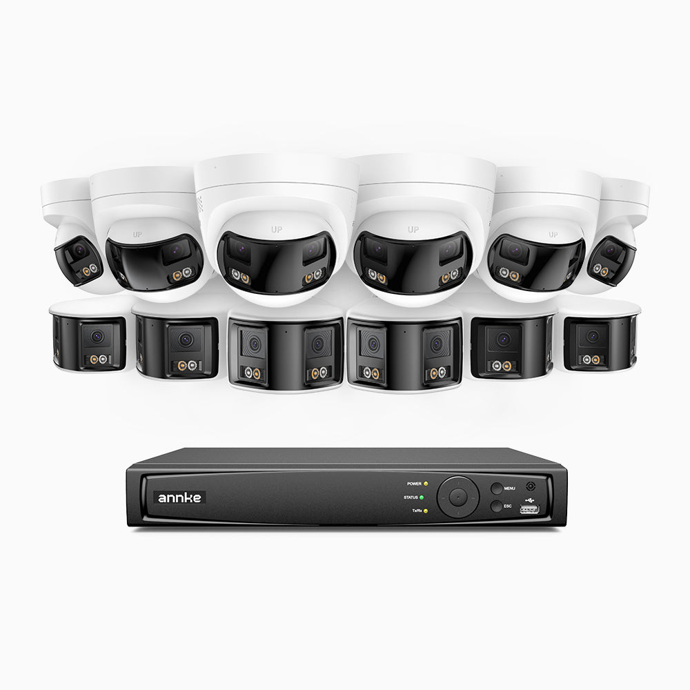 FDH800 - Kit videosorveglianza PoE doppia lente 16 canali 4K, 6 telecamere bullet e 6 telecamere, vista panoramica a 180°, visione notturna intelligente a doppia luce, audio bidirezionale, sirena e allarme attivi, rilevamento persone e veicoli, IP67