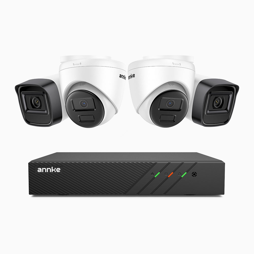 H300 - Kit videosorveglianza PoE 8 canali 3MP, 2 telecamera bullet e 2 telecamera turret,  visione notturna EXIR 2.0, rilevamento del movimento, H.265+, impermeabilità IP67