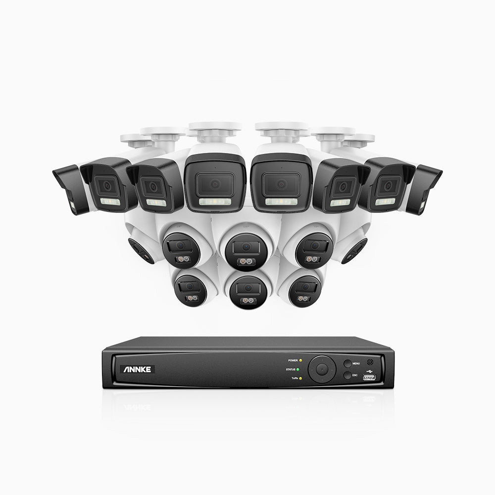 H500P - Kit videosorveglianza PoE 16 canali 3K, 8 telecamera bullet e 8 telecamera turret, visione notturna a colori e IR, risoluzione 3072*1728, apertura f/1.6 (0.005 lux), rilevamento umano e veicoli, microfono integrato, IP67