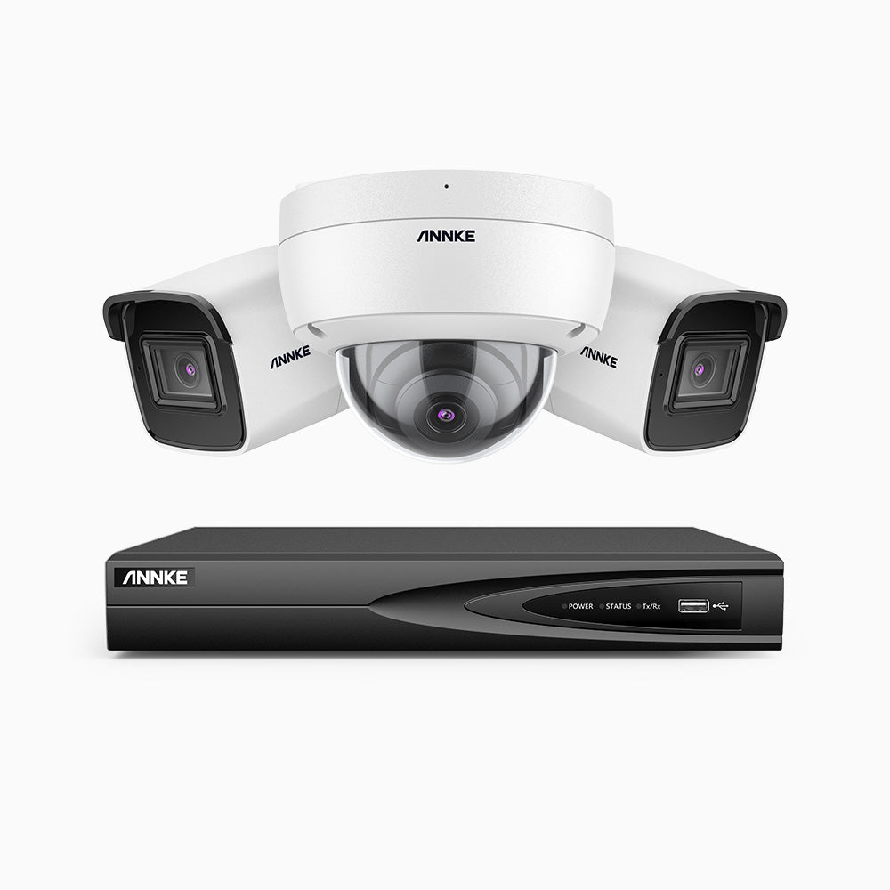 H800 - Kit videosorveglianza PoE 4 canali 8 MPX (4K), 2 telecamere bullet e 1 telecamera dome, resistente ai vandalismi IK10, visione notturna a colori e IR, microfono integrato, riconoscere di persone e veicoli, supporta ONVIF e RTSP