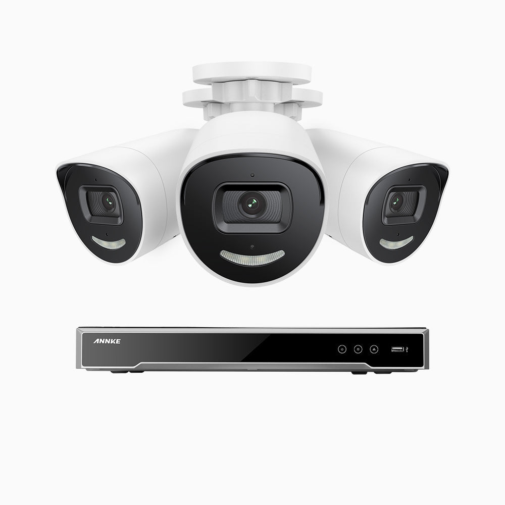 H800X - Kit videosorveglianza PoE 8 canali con 3 telecamere 4K con sensore BSI da 1/1,8'', apertura f/1,6 (0,003 Lux), sirena e allarme stroboscopico, audio bidirezionale, rilevamento di persone e veicoli, protezione perimetrale, funziona con Alexa
