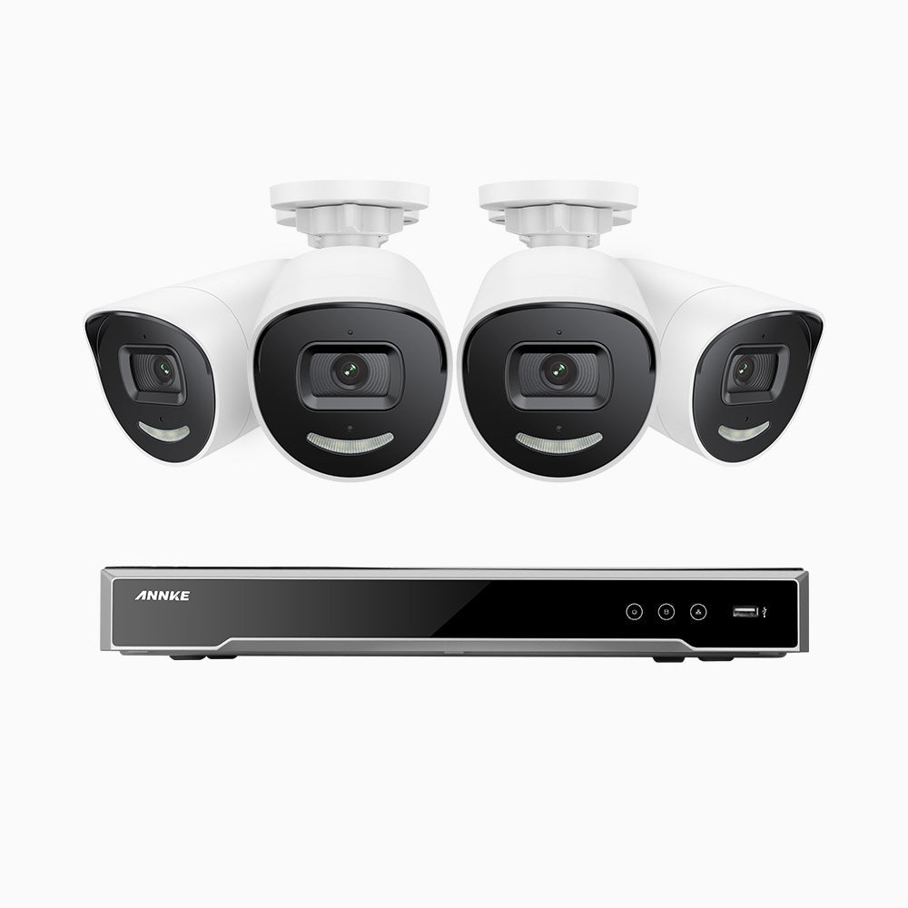 H800X - Kit videosorveglianza PoE 8 canali con 4 telecamere 4K con sensore BSI da 1/1,8'', apertura f/1,6 (0,003 Lux), sirena e allarme stroboscopico, audio bidirezionale, rilevamento di persone e veicoli, protezione perimetrale, funziona con Alexa