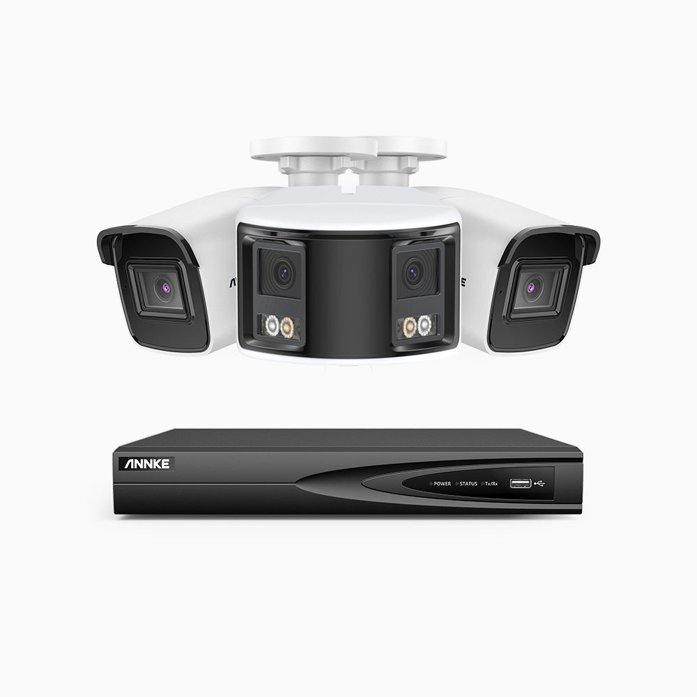 HDCK680 - Kit videosorveglianza PoE 4 canali con 2 telecamera 4K e 1 telecamera 6 MPX doppia lente(ultra grandangolo 180°), visione notturna a colori, microfono incorporato, riconoscere di persone e veicoli