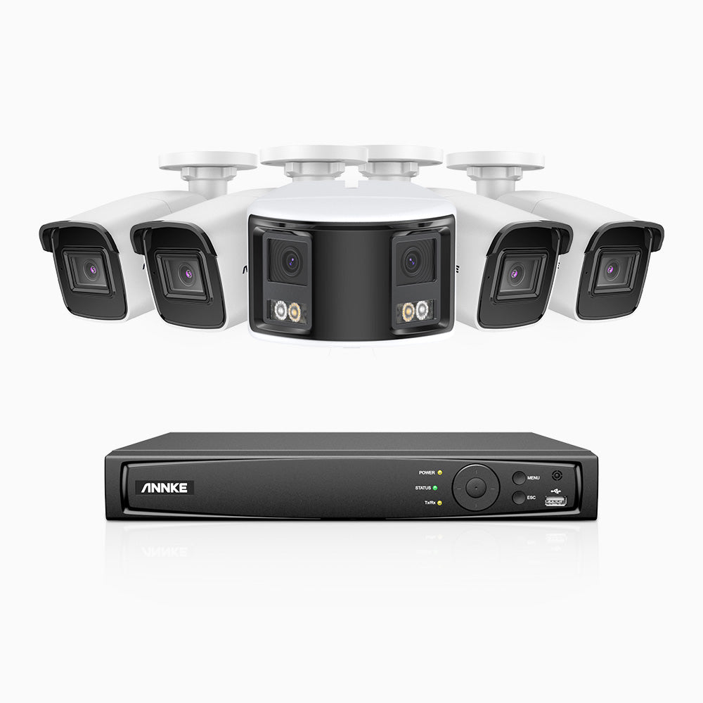 HDCK680 - Kit videosorveglianza PoE 8 canali con 4 telecamera 4K e 1 telecamera 6 MPX doppia lente(ultra grandangolo 180°), visione notturna a colori, microfono incorporato, riconoscere di persone e veicoli