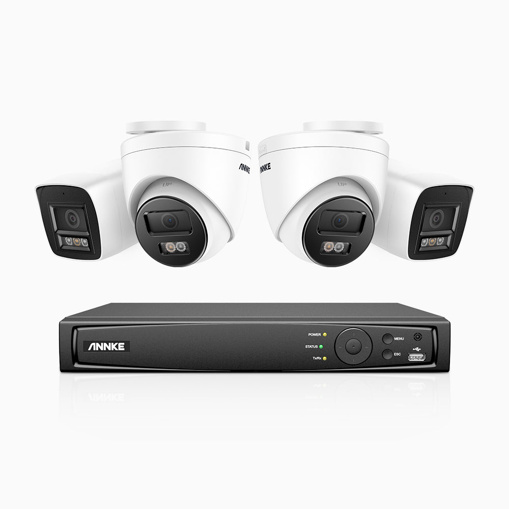 H1200 - 8-channel 4K 12MP PoE video surveillance kit, 2 bullet cameras and 2 turret cameras, visione notturna a colori e IR, Rilevamento umano e veicolare, H.265+, Microfono integrato, Archiviazione locale fino a 512 GB, IP67