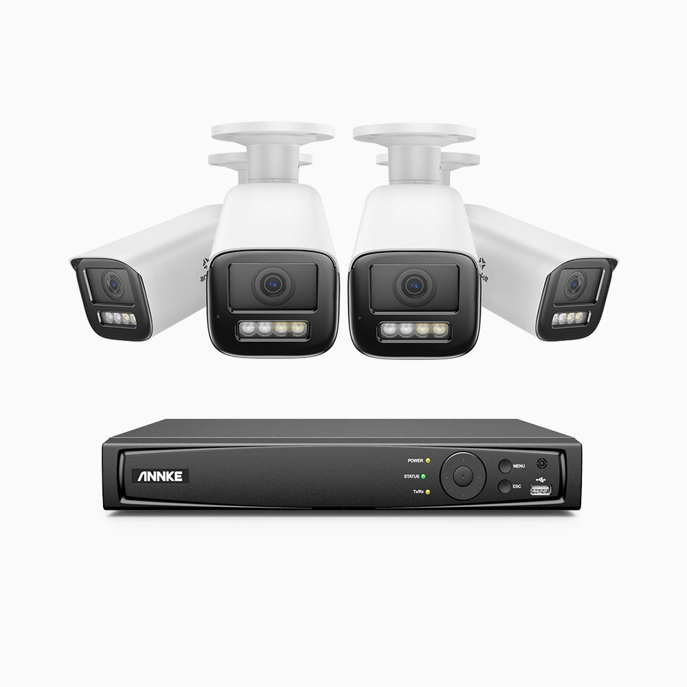 HZ804 - Kit videosorveglianza PoE 8 canali con 4 telecamere 4K, zoom ottico 4X, doppia luce visione notturna, rilevamento del movimento 2.0, Microfono integrato, sirena e allarme stroboscopico