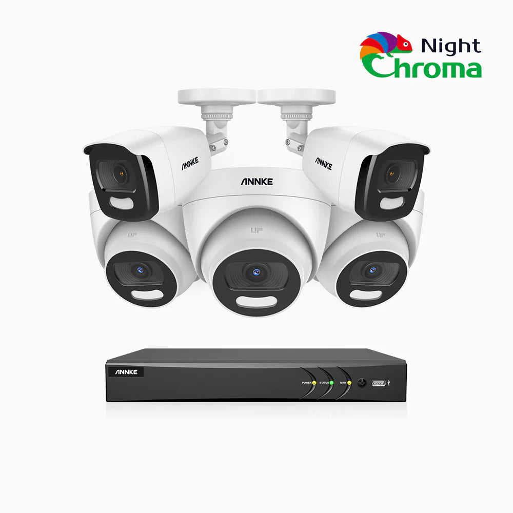 NightChromaTM NCK500 - Kit videosorveglianza PoE 8 canali 3K, 2 telecamere bullet e 3 telecamere turret, visione notturna a colori Acme, f/1.0 Super apertura, 0.001 Lux, allineamento attivo, microfono integrato, slot scheda MicroSD