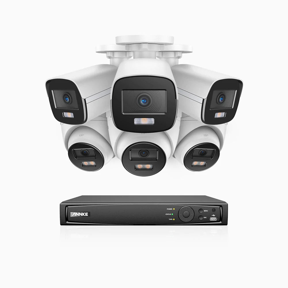NightChromaTM NCK500 - Kit videosorveglianza PoE 8 canali 3K, 3 telecamere bullet e 3 telecamere turret, visione notturna a colori Acme, f/1.0 Super apertura, 0.001 Lux, allineamento attivo, microfono integrato, slot scheda MicroSD